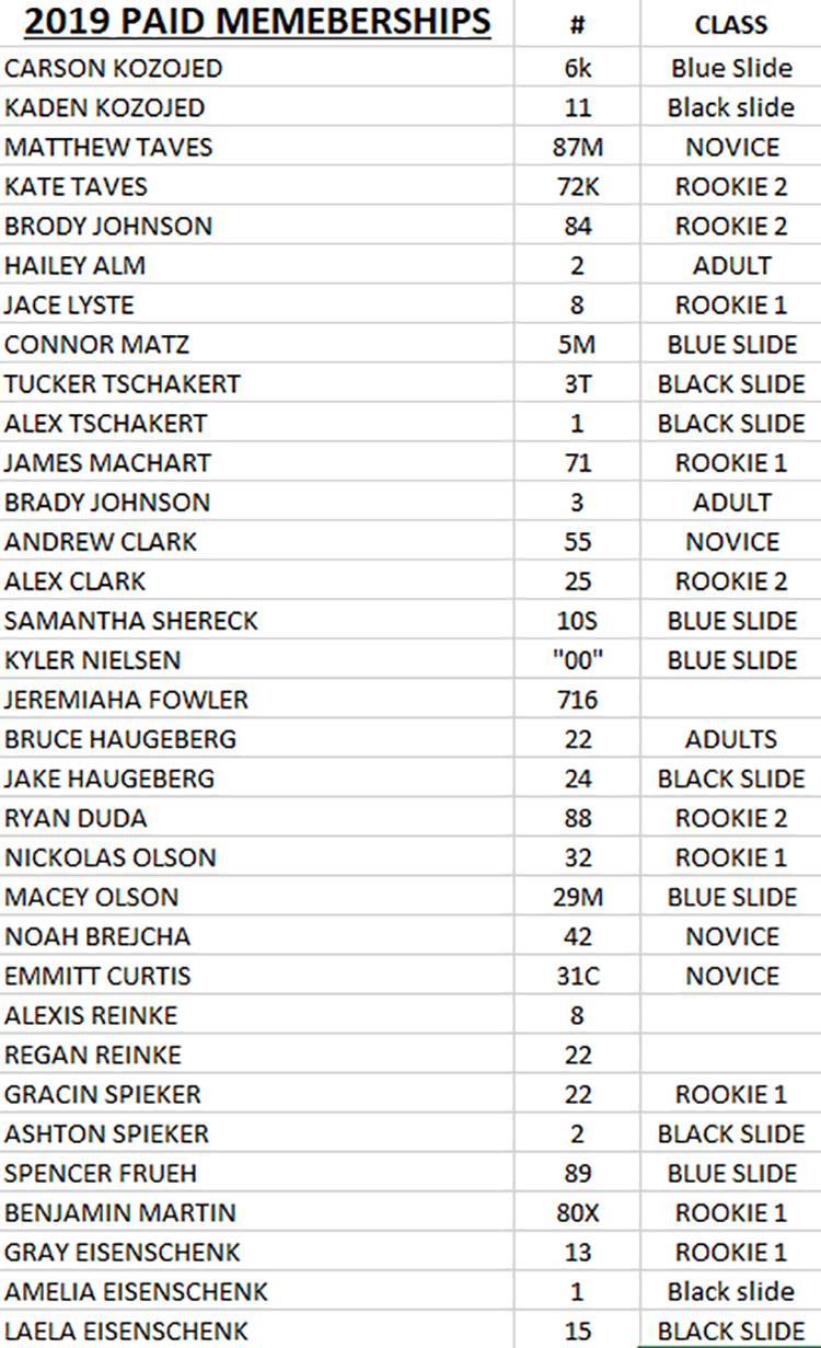 Below are the paid members of the 2019 Red River Kart Club. We need sweatshirt sizes for those drivers. (They come in Adult and Youth sizes XS through XL.) Please text your name and sweatshirt size to: 701-238-3200 as soon as possible. Thank you!
