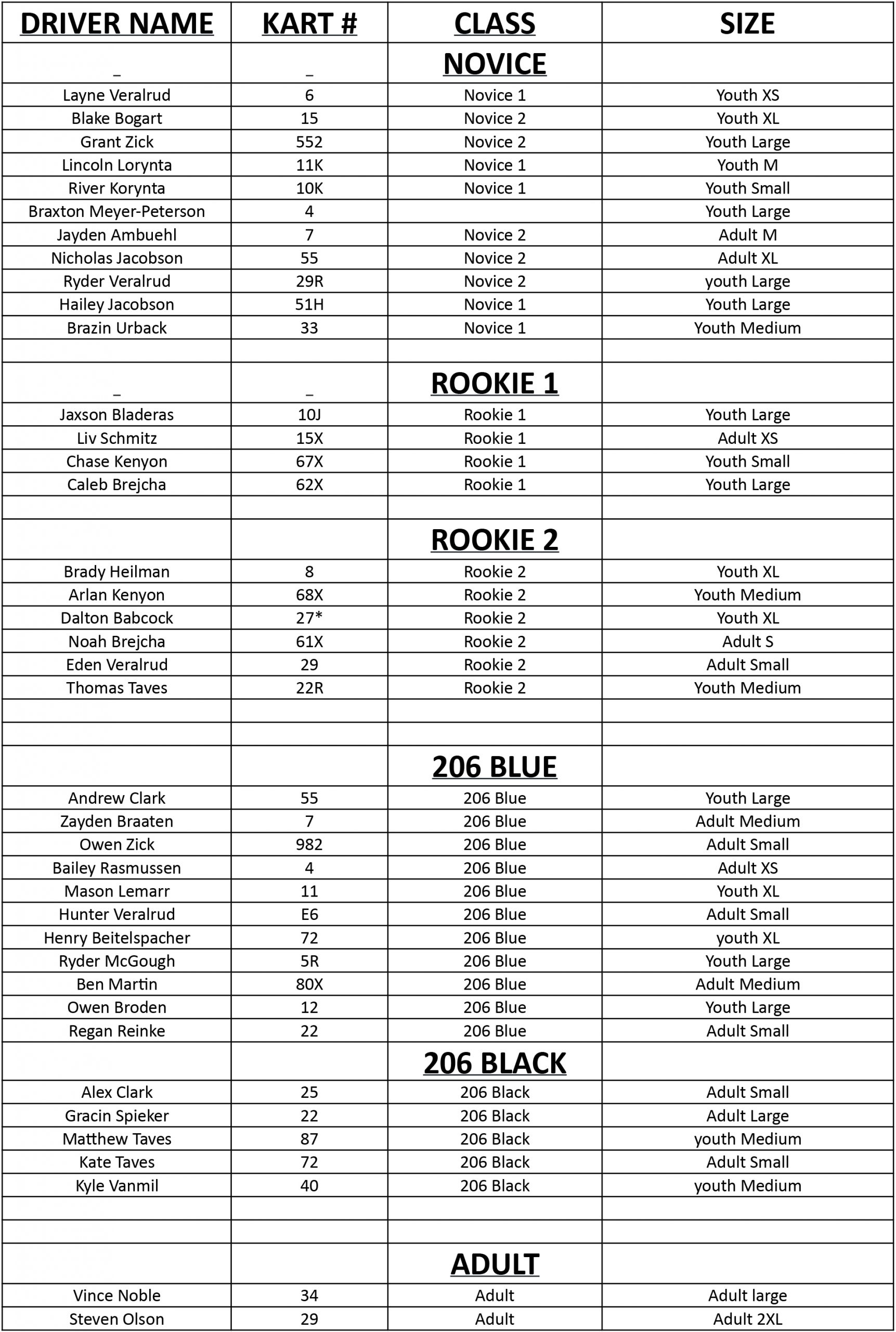 Each 2022 Member of the Red River Kart Club will be receiving a hat & jacket. Below are the names and sizes that were submitted on your membership forms along with the most recent updates. Please double-check jacket SIZE and KART #.