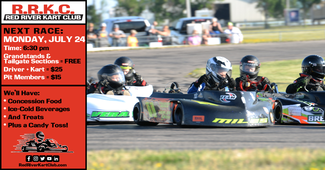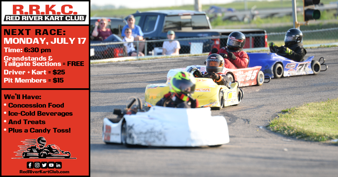 Sponsored by: Monday, July 31 • Heats 1 & 2 Monday, August 7 • Heat 3 and Feature Race • Meet & Greet during Intermission Times: Gates Open: 5:30 pm Driver Draw Cutoff: 6:15 pm Race: 6:30 pm Prices: Grandstands & Tailgate Sections = FREE Driver + Kart = $25 Pit Members = $15 […]