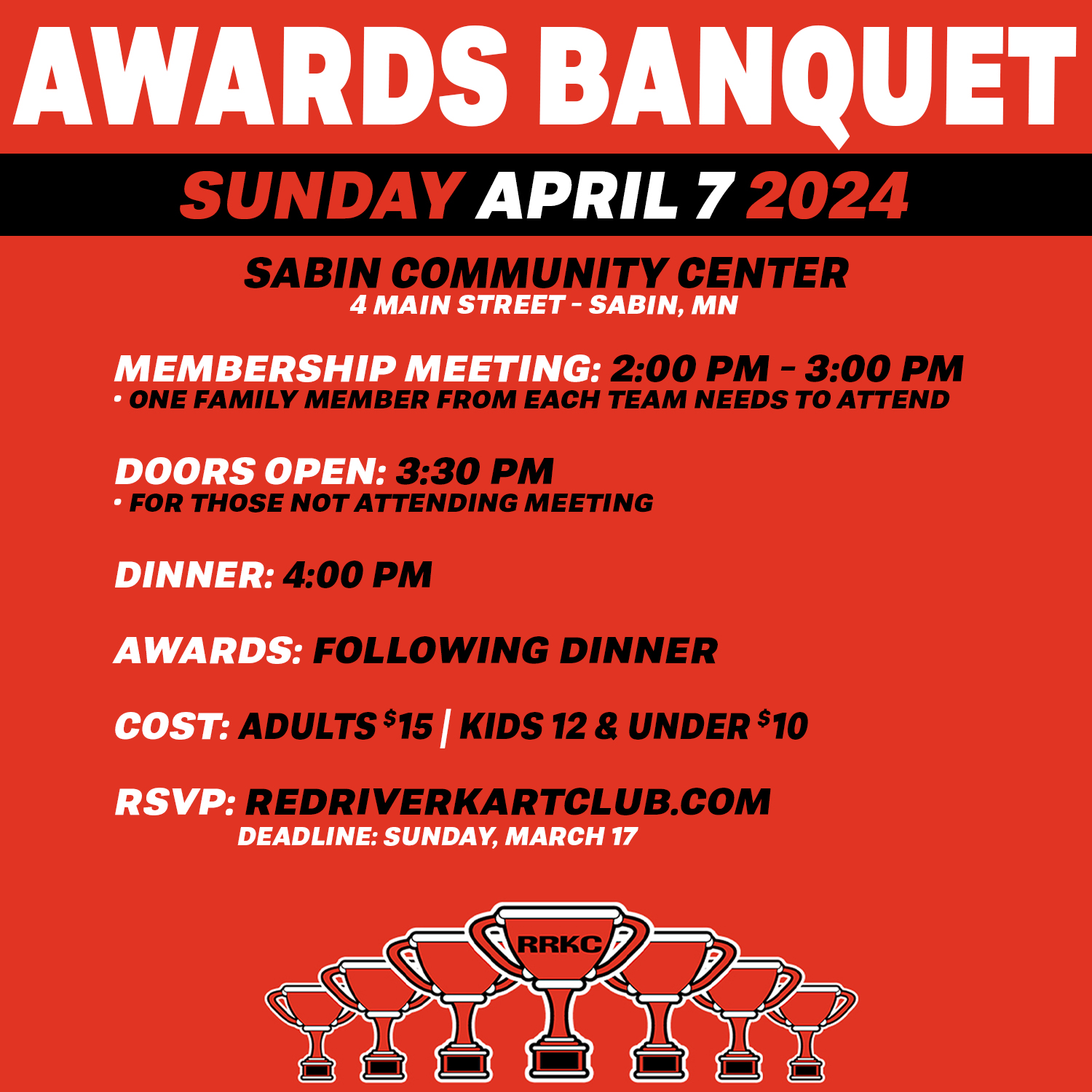 The 2024 Red River Kart Club Awards Banquet has been rescheduled for Sunday, April 7 at the Sabin Community Center. If you previously RSVP’d but would like to change your info, please send us a message through our Facebook page. The new RSVP deadline is Monday, April 1.