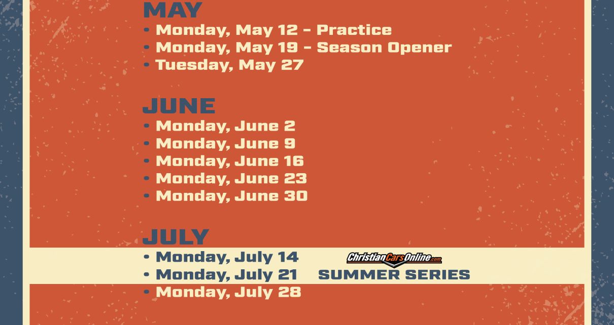 RACE TEAMS: During the races on Monday, June 9, we’ll be handing out awards for the 2024 ChristianCarsOnline.com Summer Series. If you’re on this list, head over to the frontstretch at intermission to receive your award. If you’re unable to attend, we’ll announce next week alternative pick-up arrangements. Times: Gates Open: 5:30 pm Driver Draw […]